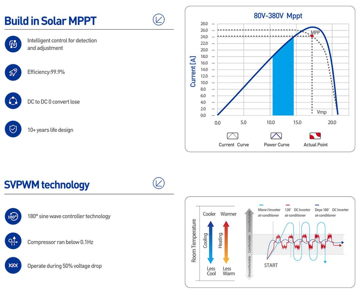- How they work: The unit's intelligent internal controller, a core technology that Deye has mastered since 2007, detects the amount of solar power being generated. During peak sun hours, the compressor and fan operate on the free DC power from the panels. As the sun sets or if clouds roll in, the system automatically draws supplemental power from your home's electrical grid to maintain continuous cooling. This eliminates the need for expensive battery banks and ensures uninterrupted comfort.