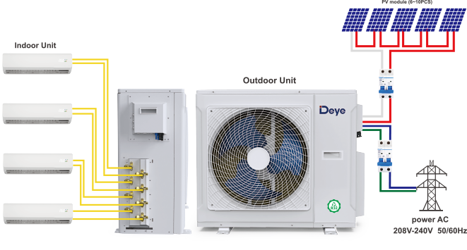Eliminating the need for external battery storage, this system integrates a high-perfor-mance solar MPPT booster and a dual-mode AC/DC inverter directly into its centralized outdoor unit. The MPPT technology ensures maximum capture of solar energy by dy-namically adjusting to sunlight intensity fluctuations, while the built-in inverter enables seamless switching between solar DC power and grid AC power-prioritizing renewable energy supply to minimize reliance on traditional electricity grids. Ideal for multi-room residential properties or small commercial premises,it delivers con-sistent, zone-specific temperature control while cutting down overall energy costs and carbon footprint.